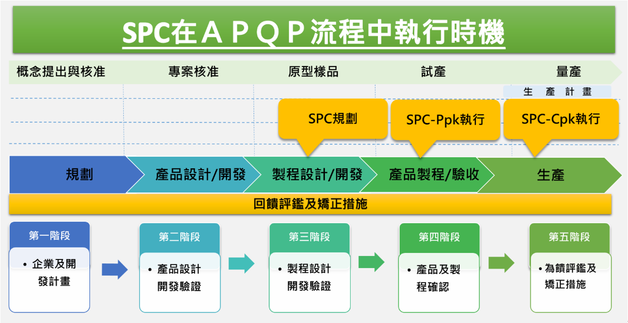在實施SPC之前,最好是由跨功能小組在設計失效模式及效應分析(DFMEA)中確定設計或製程的關鍵參數或指標。然後,在APQP第四階段與MSA一起實施比較妥當,並將根據這些關鍵參數或指標進行收集和監視數據。