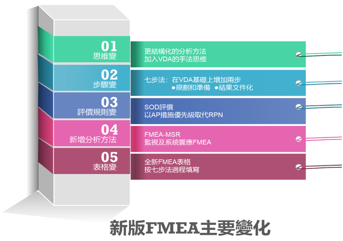 FMEA主要應用在產品設計與製程設計階段,也就是APQP的二、三階段所進行的失效模式分析,常見的有DFMEA(Design Failure Mode and Effects Analysis, 設計失效模式及效應分析)及PFMEA(Process Failure Mode and Effects Analysis, 製程失效模式及效應分析),亦即產品尚未正式量產前,針對構成產品的子系統、零件及過程中的每一步驟進行分析,找出所有可能的風險,並依據評價結果採取預防性的措施。除非現有產品的設計或製程發生改變時,才需重新開始啟動DFMEA或PFMEA,否則像是此次FMEA改版(如圖二),除非客戶有要求,現有產品的相關FMEA文件是不用更新成最新版。由於FMEA能夠消除或減少潛在失效發生的機會,是汽車業界認可的最能減少「召回」事件的質量預防工具。