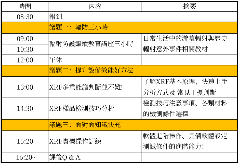 - 高雄場:11/ 13(四),輻防三小時與日立XRF課程 。