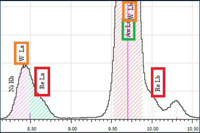 圖一、金、錸、鎢元素在X光能譜上極為相近、不易辨識