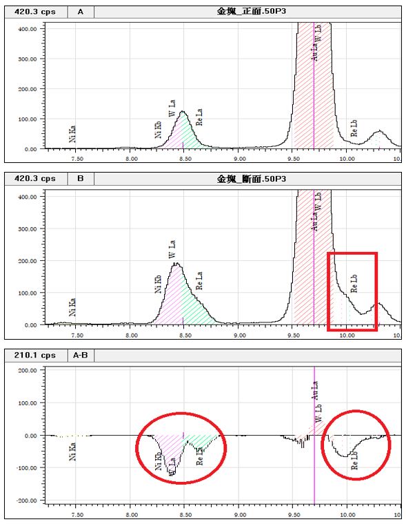 同時,透過儀器能譜差異比對的功能,如圖二所示,可以發現,切斷面與金塊上下正面的能譜最大的差異在於,切斷面明顯多出錸及鎢成份,且金含量明顯變低。