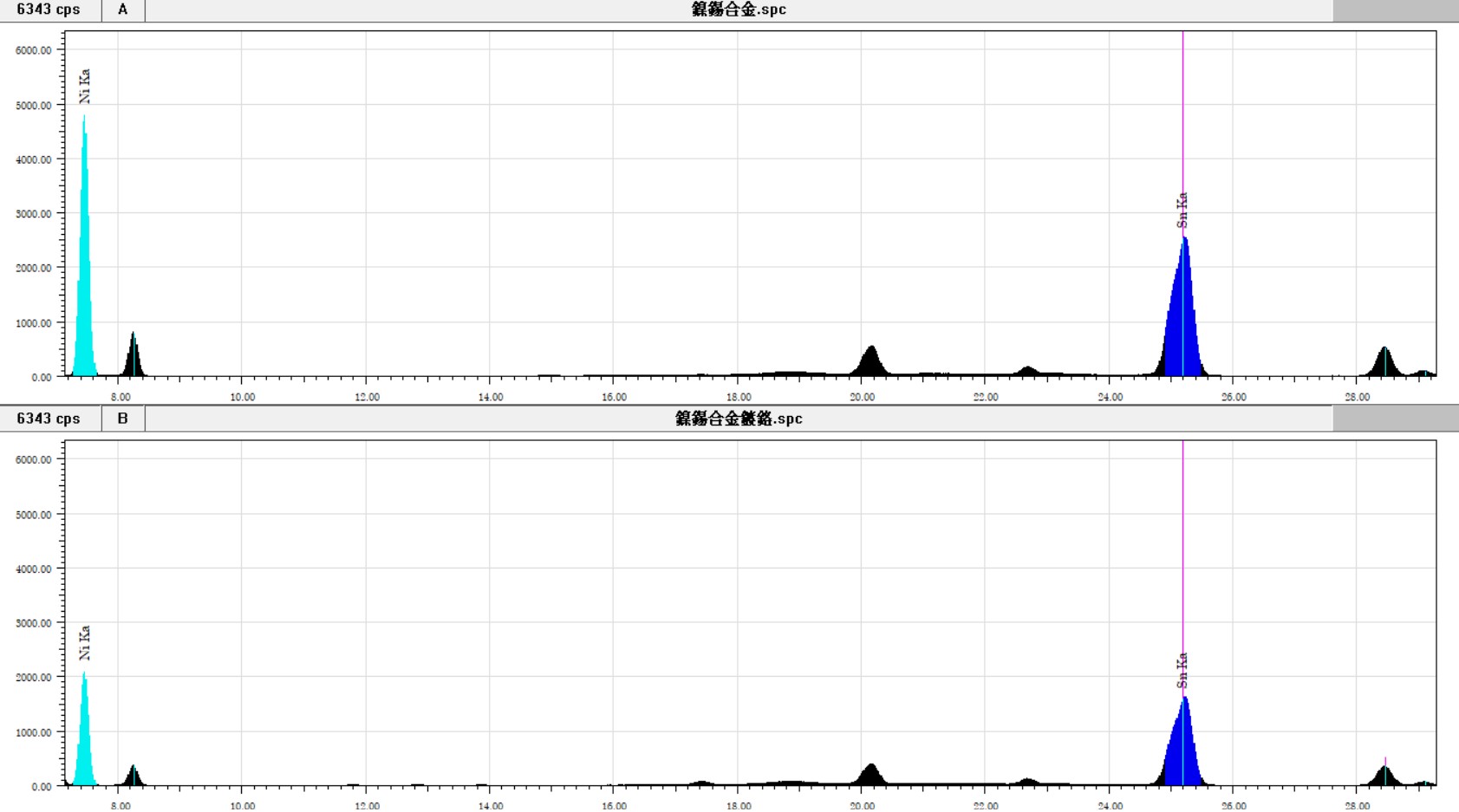 以無限厚(*註一)的鎳錫合金(鎳30%、錫70%)為底材,配合鉻鍍層標準品(含鐵,厚度為1.01μm)進行檢測(測量能譜如圖三、結果如表一)。