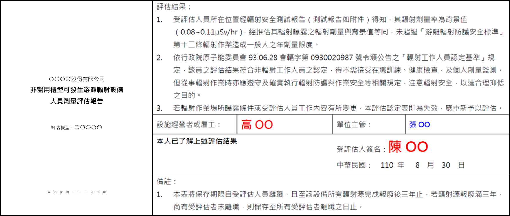 - 書面確認:評估結果須以書面載明(如「輻射工作人員認定表」),並由評估人(輻防人員)、設施經營者(或雇主)及被評估人共同簽署確認,如圖一之評估報告。